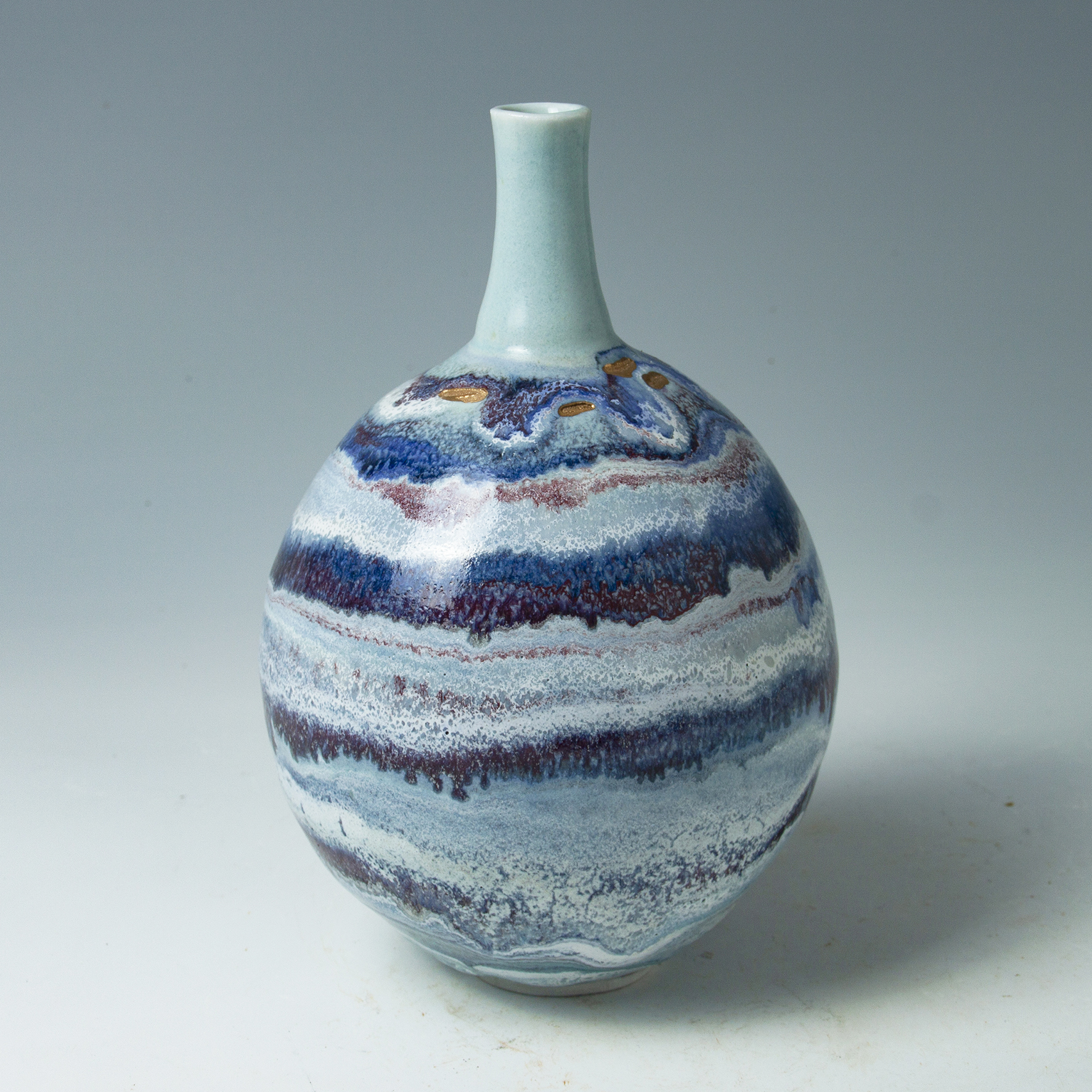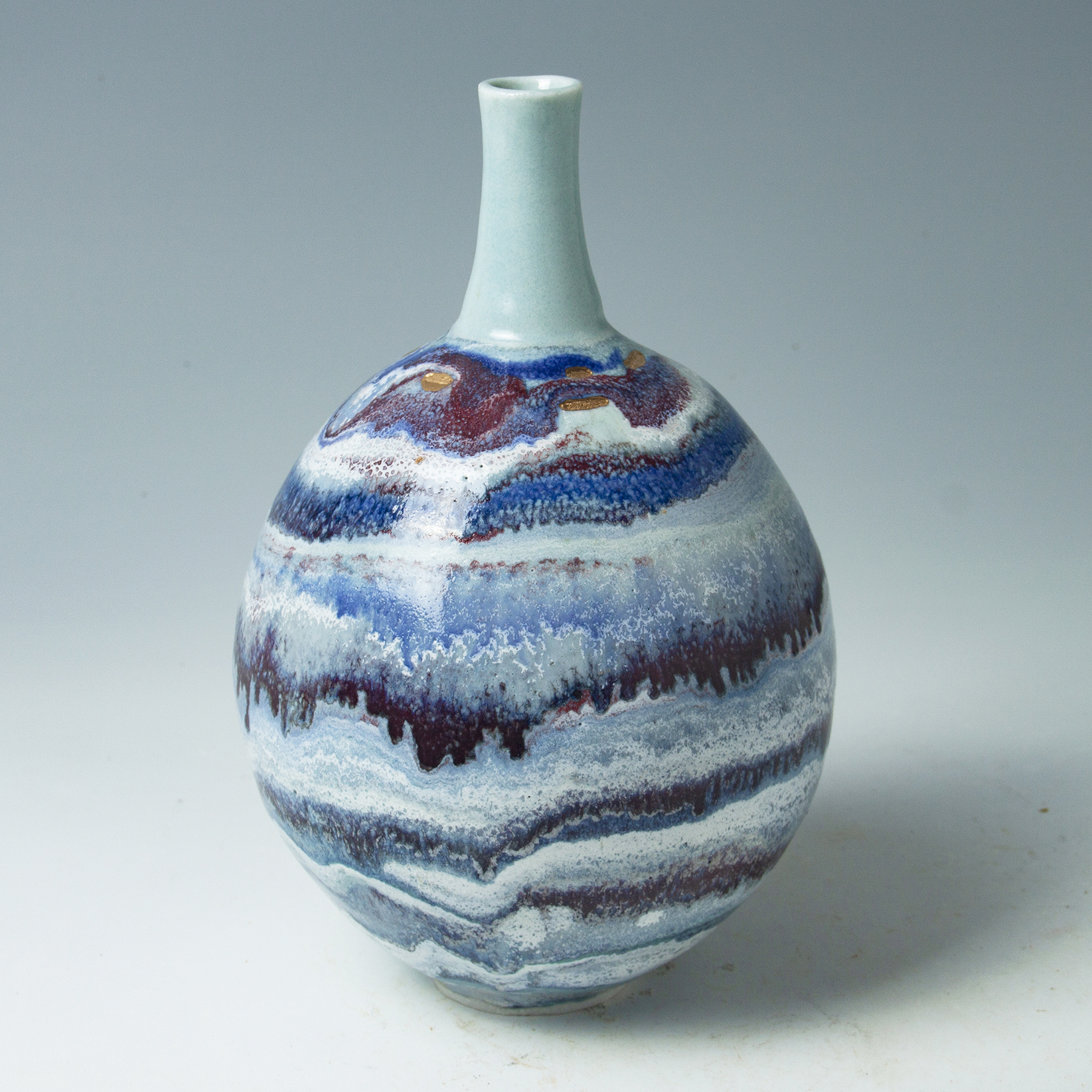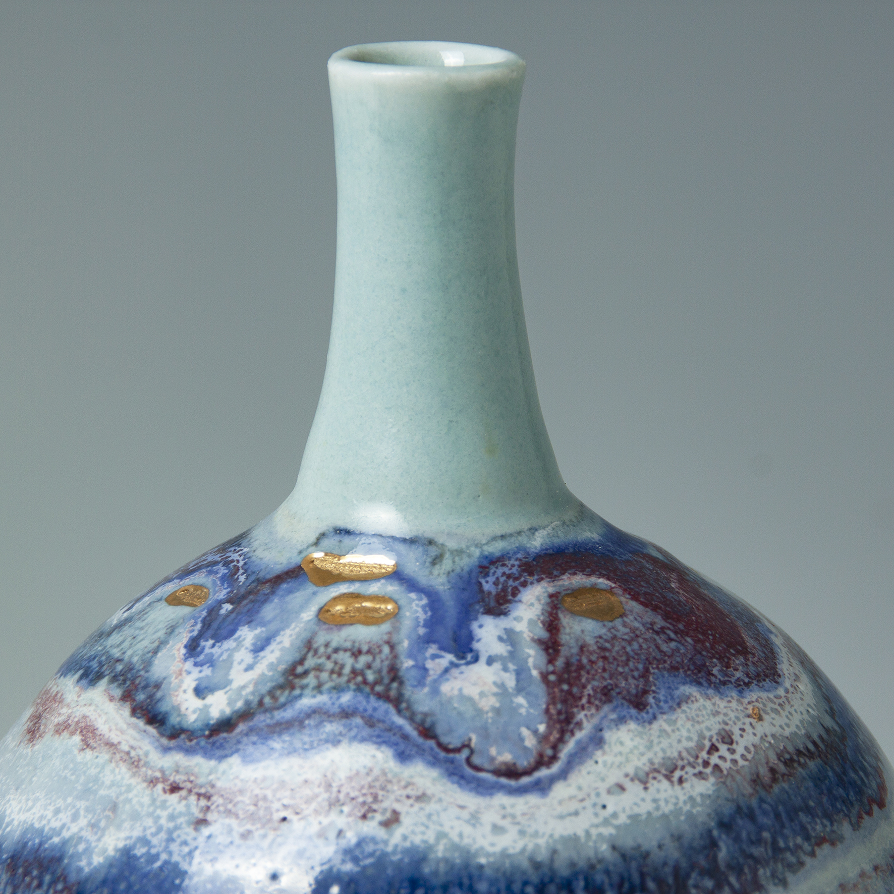 This small bottle form was thrown on the wheel in fine porcelain. Brushed glazes interact in the long high temperature firing to suggest depth and movement in the surface.