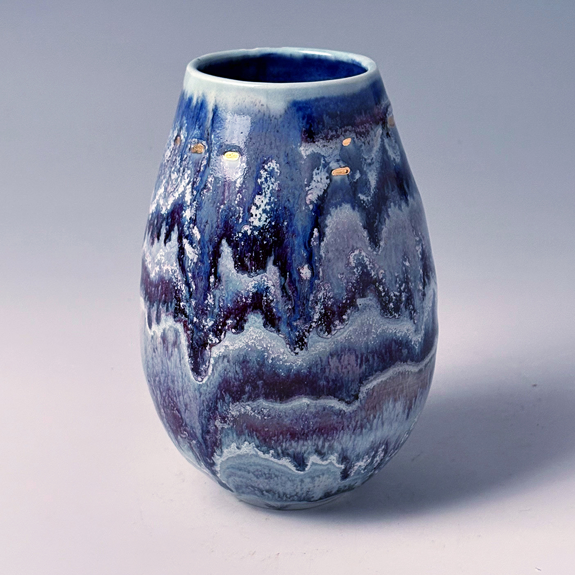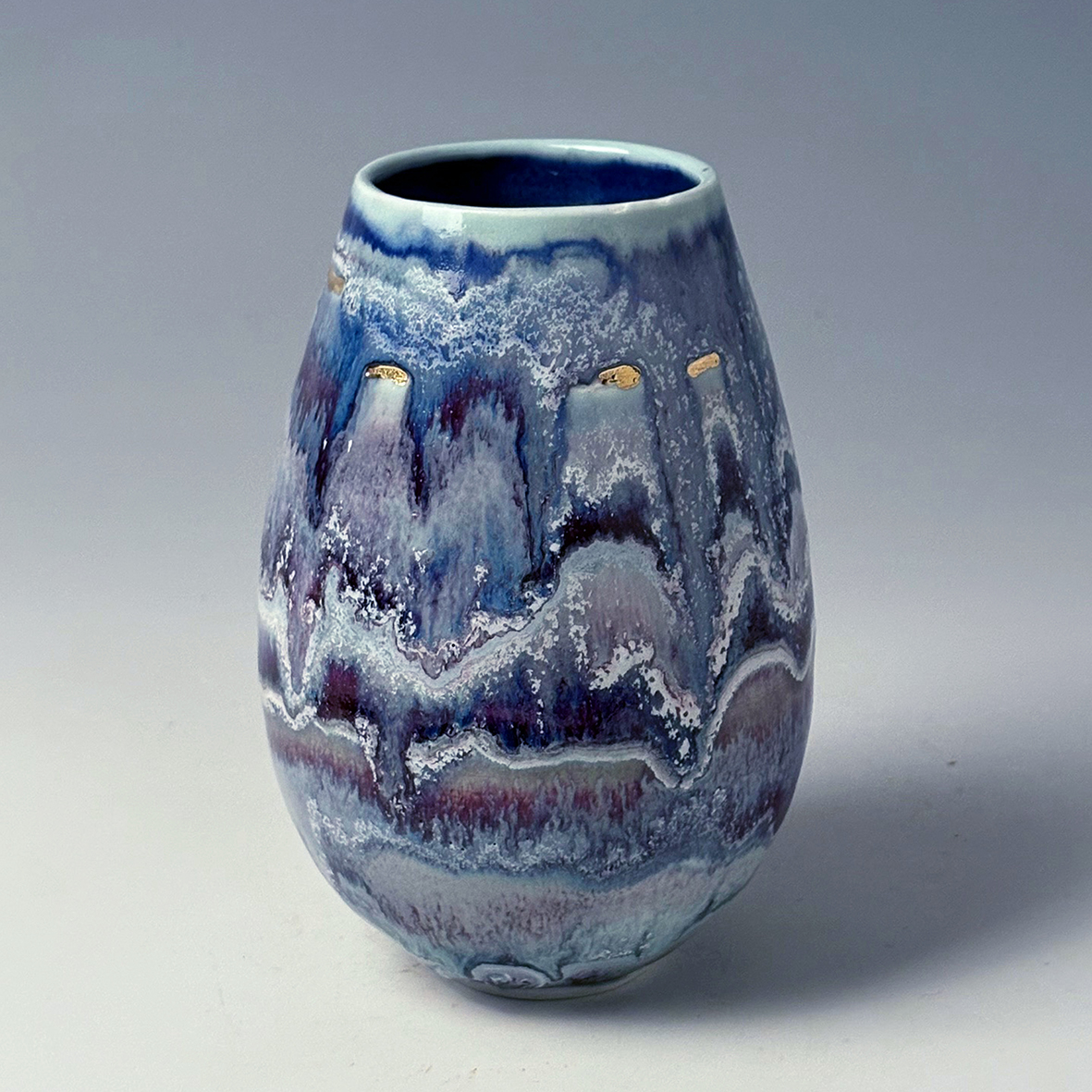 This vase was thrown on the wheel in fine porcelain. Extra brushed glazes interact in the firing to suggest a sense of depth and movement.